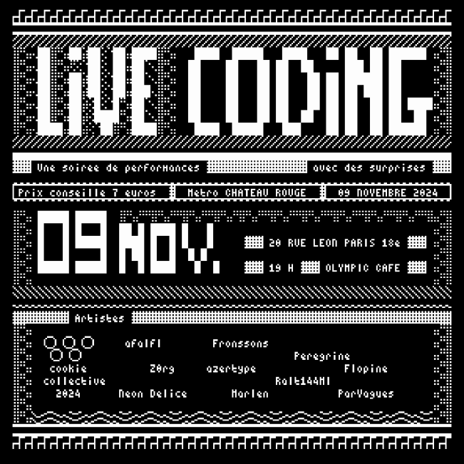 To meet live coders in Paris, contact the Cookie Collective : https://cookie.paris. You can also check out links and people on https://livecoding.fr. The next live coding show is taking place very soon on the 9th of November and another algorave is coming very soon right after it.