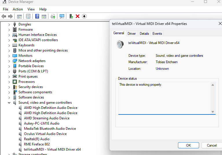 I’ve checked in the Device Manager, under Sound, Video and Game Controllers and the VirtualMIDI driver seems working fine.