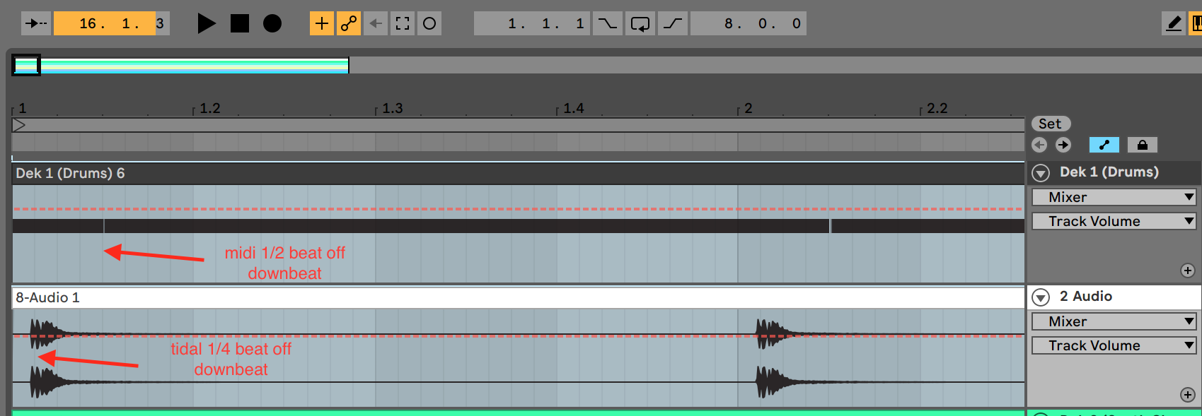 The downside of this method is you can't sync tempo changes in Ableton back to Tidal, Tidal has to always be the leader. The upside is that if stuff is out of sync you can just nudge it around, which you can't really do with Link. Plus it's one less bit of software to worry about (not needing to run Carabiner). It's not very slick, but it does work.