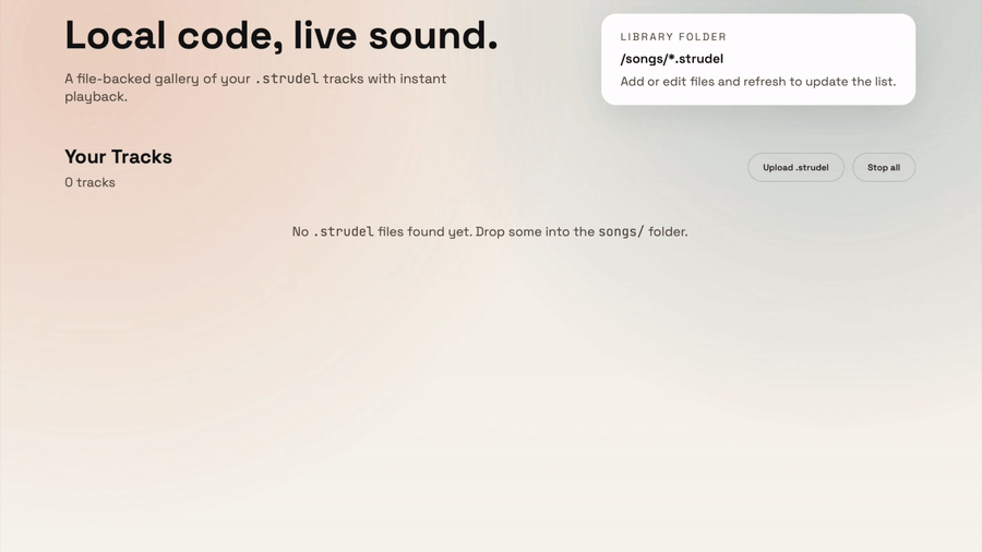 Hello Strudel community! I am a recent Strudel user along with my music partner leo and we absolutely love the app/language/engine. One of the gaps we found using strudel was there was no way to share tracks locally to just have fun ( I also didnt search it up so if theres anything out there I would love to check it out!). As a dev I decided to build Strudel Library ( javierorosario/strudel-music-library - Codeberg.org ). Its basically a self‑hosted, file‑based Strudel library that lets you browse and play .strudel tracks like a gallery. I’m going to list some of what i think are the main features:
